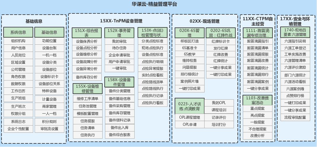 現(xiàn)場6S管理,全員持續(xù)改善,精益生產(chǎn),CTPM自主保全,TnPM設(shè)備管理,班組建設(shè),員工績效與技能提升,一站式采購