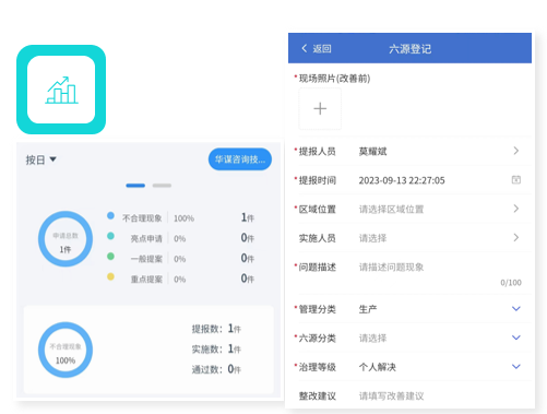 自動(dòng)生成跑冒滴漏清單,指定負(fù)責(zé)人制定處理對策,線上提交處理結(jié)果和驗(yàn)收,全程閉環(huán)跟蹤,支持整改成果分享展示