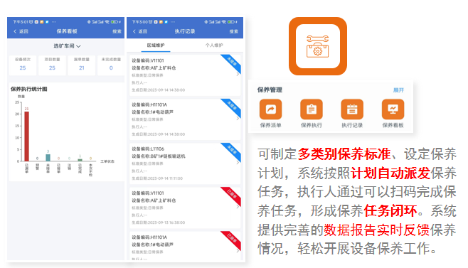 制定自主保全標(biāo)準(zhǔn)和計(jì)劃、自動(dòng)派單,掃碼執(zhí)行,并提供保養(yǎng)看板自動(dòng)更新任務(wù)進(jìn)度