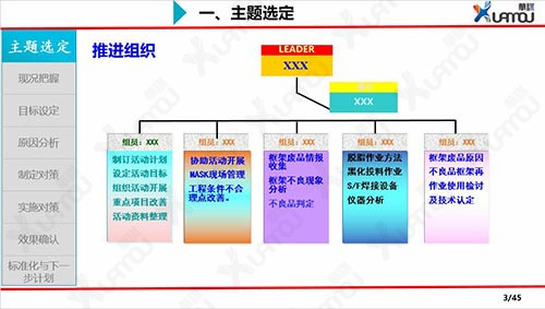 - 1: QCC組成部門級別、班組級別的品質(zhì)圈,選定主題,協(xié)調(diào)各方資源對問題進(jìn)行小組改善。